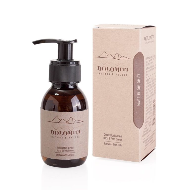 Crema Mani Piedi Dolomiti è un’emulsione a base di Burro di Karitè, Oli Vegetali, Cellule Staminali Vegetali di Stella Alpina e Acqua delle Dolomiti. Contrasta le screpolature di mani e piedi grazie alla sua azione emolliente e protettiva e protegge mani e piedi dagli agenti esterni negativi. Applicare la crema nelle zone interessate con un massaggio prolungato fino a completo assorbimento.